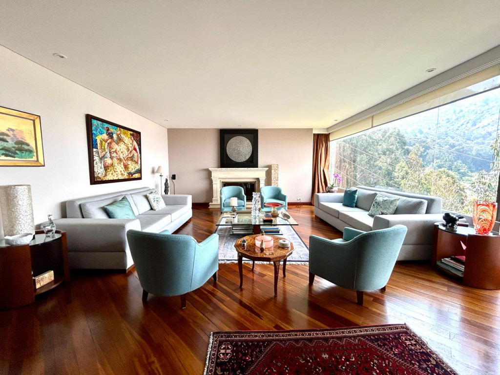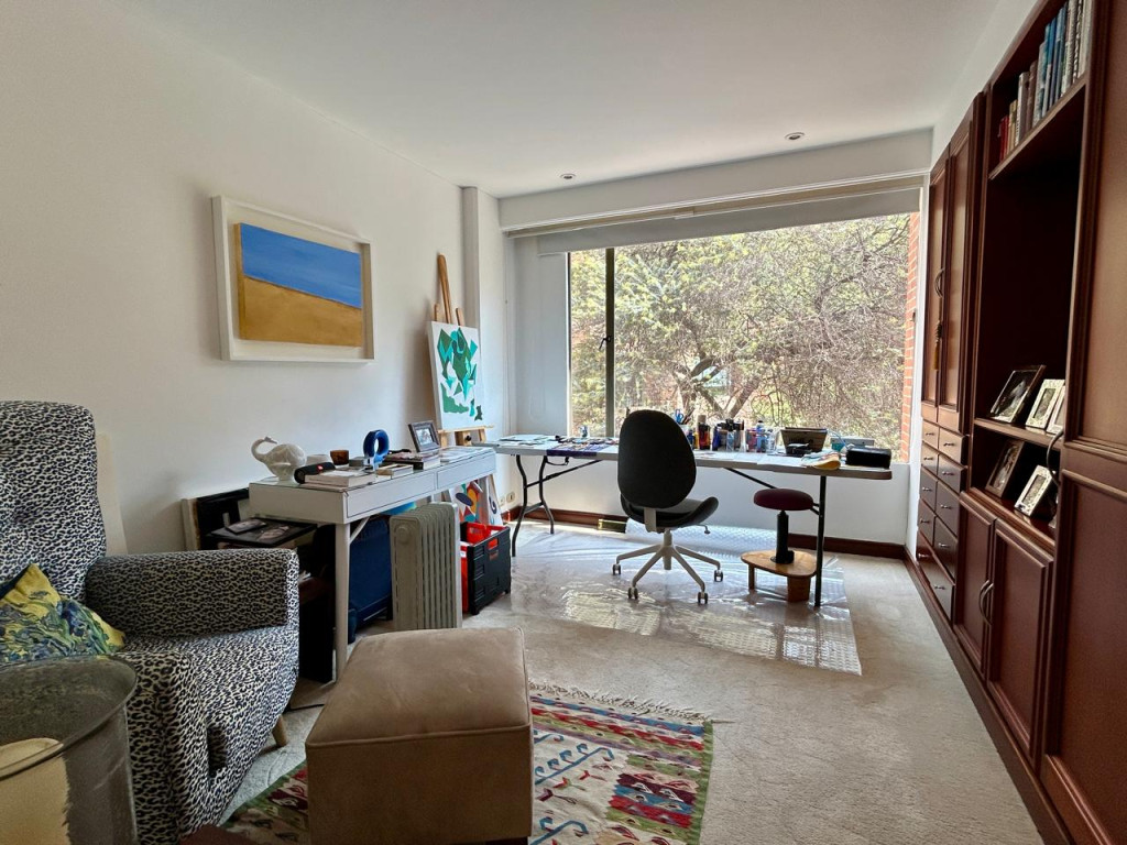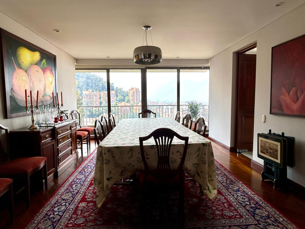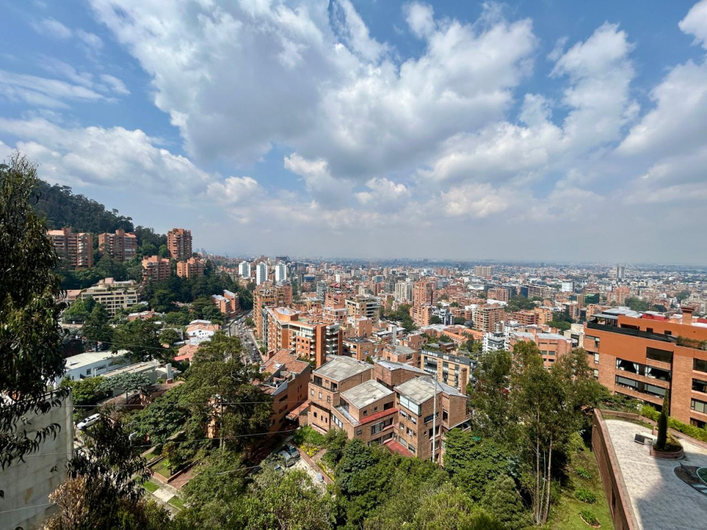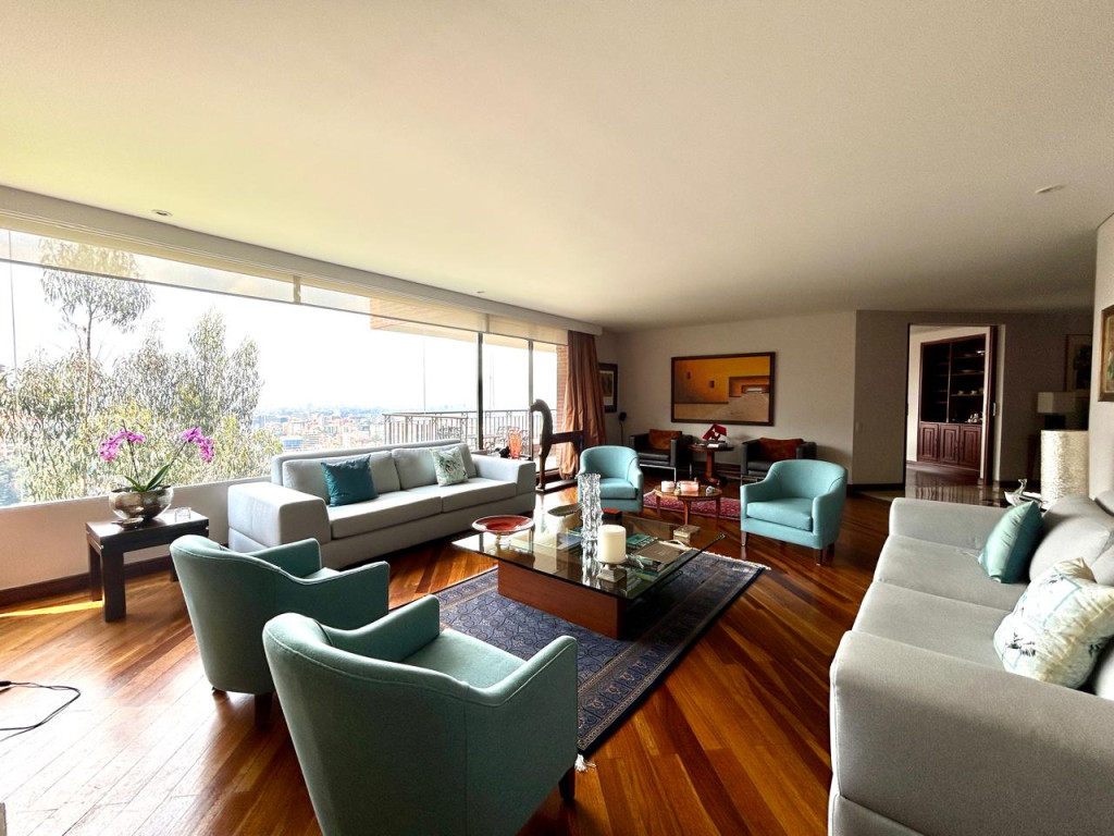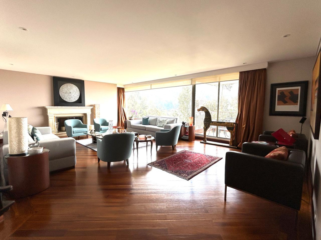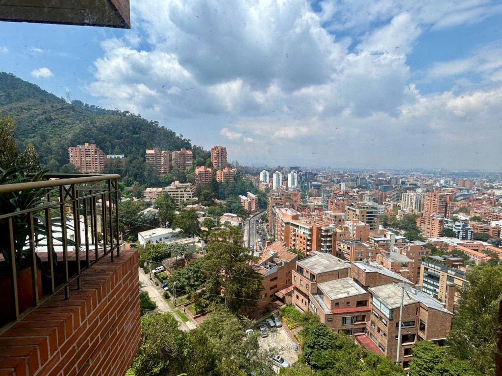 (19833) ESPECTACULAR APARTAMENTO CON VISTA 360 GRADOS EN CHICÓ ALTO. Con una ubicación privilegiada en Chicó Alto, en la zona conocida como la raqueta, encontramos este maravilloso apartamento en quinto piso totalmente exterior, con vista hacia la ciudad y también hacia parque. Amplísimos espacios maravillosamente distribuidos, con excelente entrada de luz natural en todos sus espacios. Sala con chimenea funcional, comedor independiente con salida a una terraza con vista hacia Bogotá, cocina cerrada muy ventilada con zona de lavandería independiente y cuarto y baño de servicio. Estudio muy amplio totalmente independiente con chimenea funcional. Baño social. Cuatro habitaciones, dos de ellas con baño privado. La principal con amplio walking closet y salida a terraza con vista a parque. Dos de las habitaciones auxiliares comparten un baño. Cuenta con tres parqueaderos y depósito. Edificio robusto con vigilancia 24 horas, salón social, gym, squash, sauna y turco y parqueaderos de visitantes. Zona muy tranquila con vías de acceso como la av. Circunvalar, cra. 7, calle 85 y calle 94. Facilidad de transporte público.